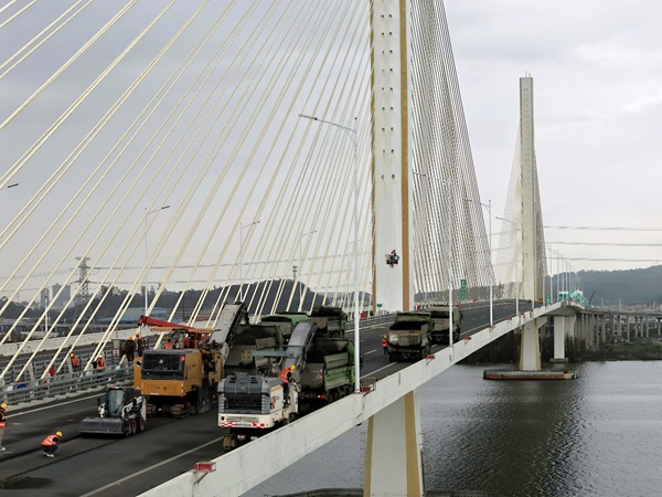 在施工现场可以正常的看到,铣刨机已驶上桥面作业,正在切除大桥旧的路面层。为维护沿线水域生态和空气环境,施工全程使用了洒水车降尘,发生的沥青废料、混凝土残渣等固废,由专用车辆即时搜集、一致转运处理,施工污水经暂时沉淀池处理后再进行无害处置。